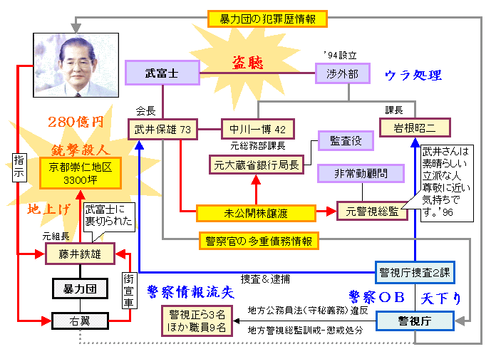 武富士が元警視総監の福田勝一氏(故人)を非常勤顧問に迎えたのは1990年代初め。顧問料は月約30万円だったが、1996年には未公開株1万数千株を譲渡されていたことが表面化した。関係者によると、武富士側は福田氏から知能犯や暴力団の捜査経歴を持つ元捜査員を紹介され、次々に社員として採用した。94年に採用された警視庁OBは、逮捕された武井保雄会長の指示で95年ごろから、同社を攻撃するために街宣活動を繰り返した右翼団体や暴力団の幹部との折衝にあたったという。